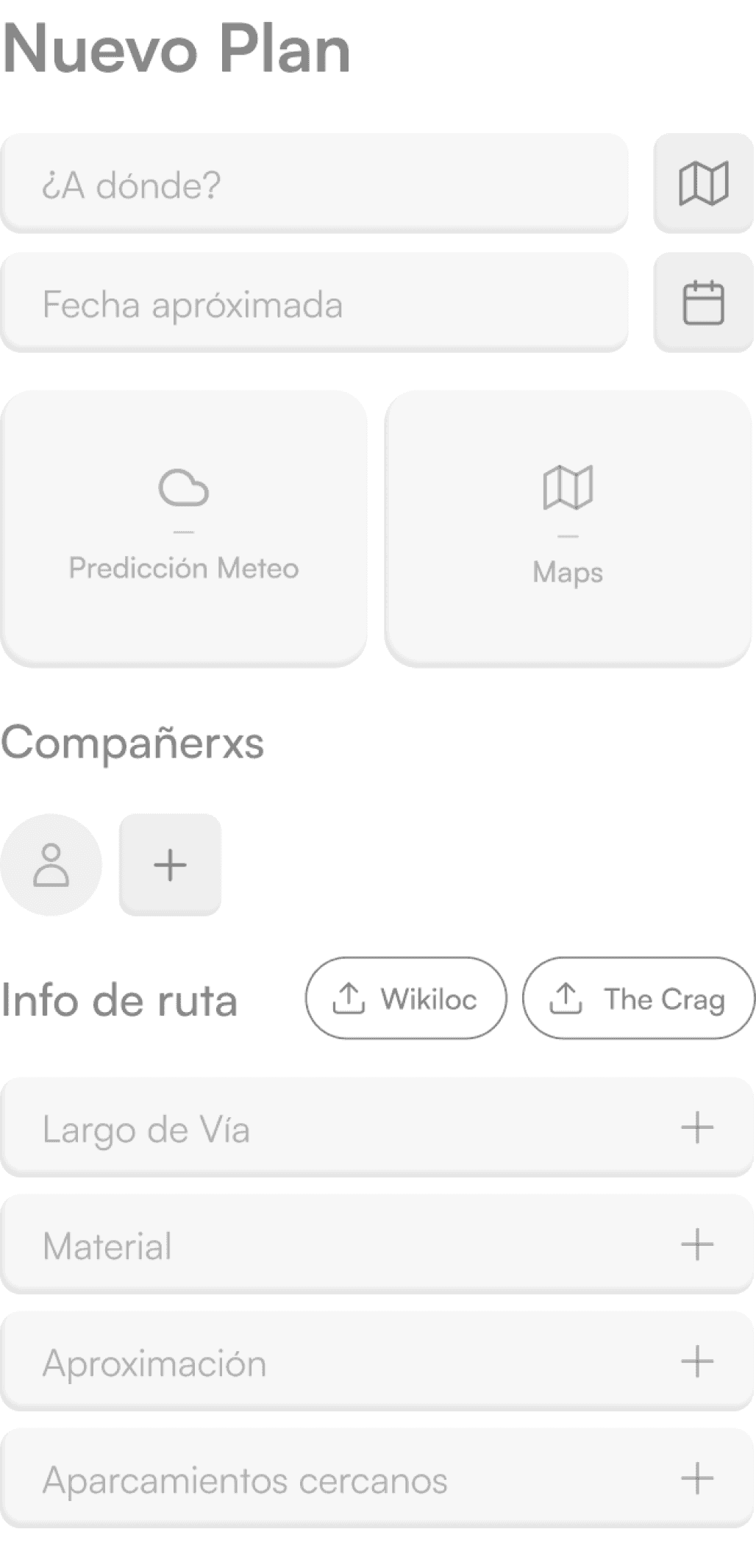 Plan is the collaborative prepping space. It follows Home’s section scheme - a heading section displaying the Weather (the most determinant factor for outdoor climbing) and underneath the on-going Plans, climbing-related Lists and basic Safety checks.