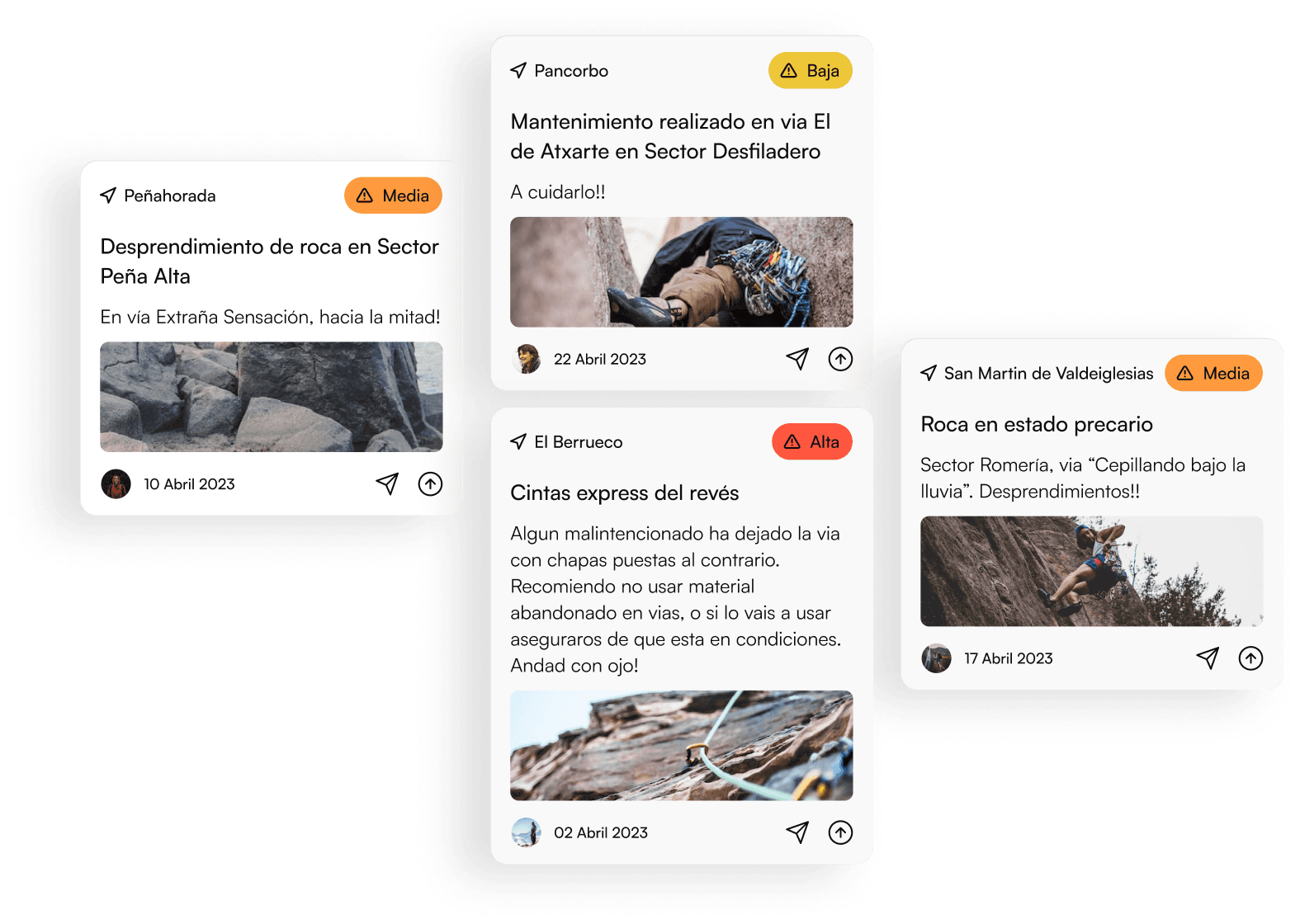 IRL local climbing groups always had access to prime news on the state of certain climbing areas through word-of-mouth. Given that taking informed decisions in high-risk sports is critical, Ropes provides global access to user-generated hints under ‘Alerts’, propelling reports by making the sharing process simple and accessible.