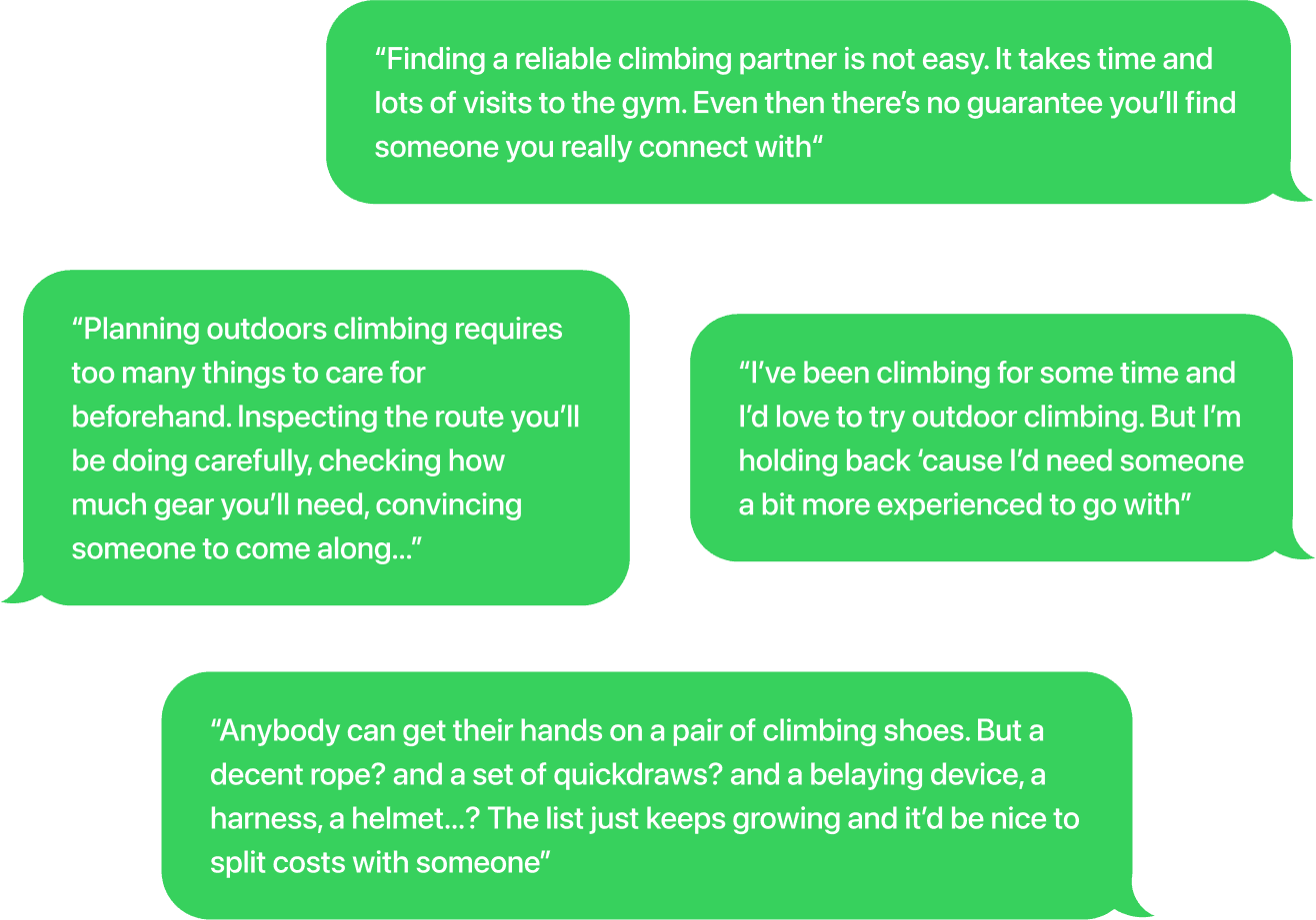 During Research, it became clear that there was a gap between what was offered by IRL climbing groups vs. the existent online alternatives.